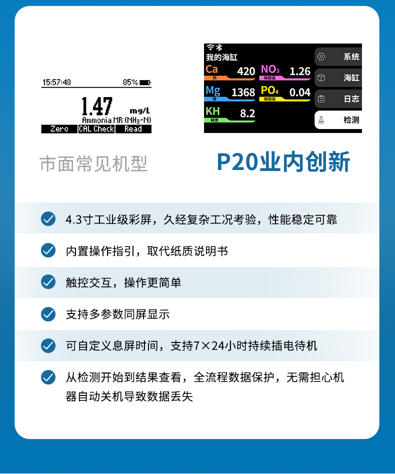 Utrao P20可手動檢測鈣、鎂、KH、NO3、PO4。