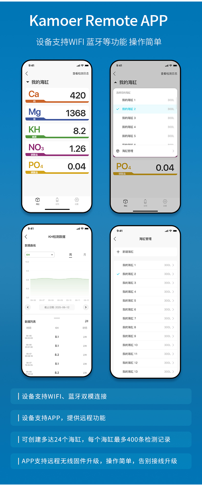 五項關鍵一次搞定:KH / Ca / Mg / NO₃ / PO₄ 自動排程檢測,數據雲端同步。